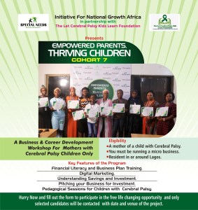 The Empowered Parent Thriving Child project is our annual Small Business Development Programme for Mothers Raising Children with Cerebral Palsy. The project was piloted in 2019 in collaboration with another organization, Special Needs Initiative For Growth, in response to the realization that most caregivers of children with Cerebral Palsy are single mothers, who are unable to hold down traditional corporate jobs because of the demands of caregiving.